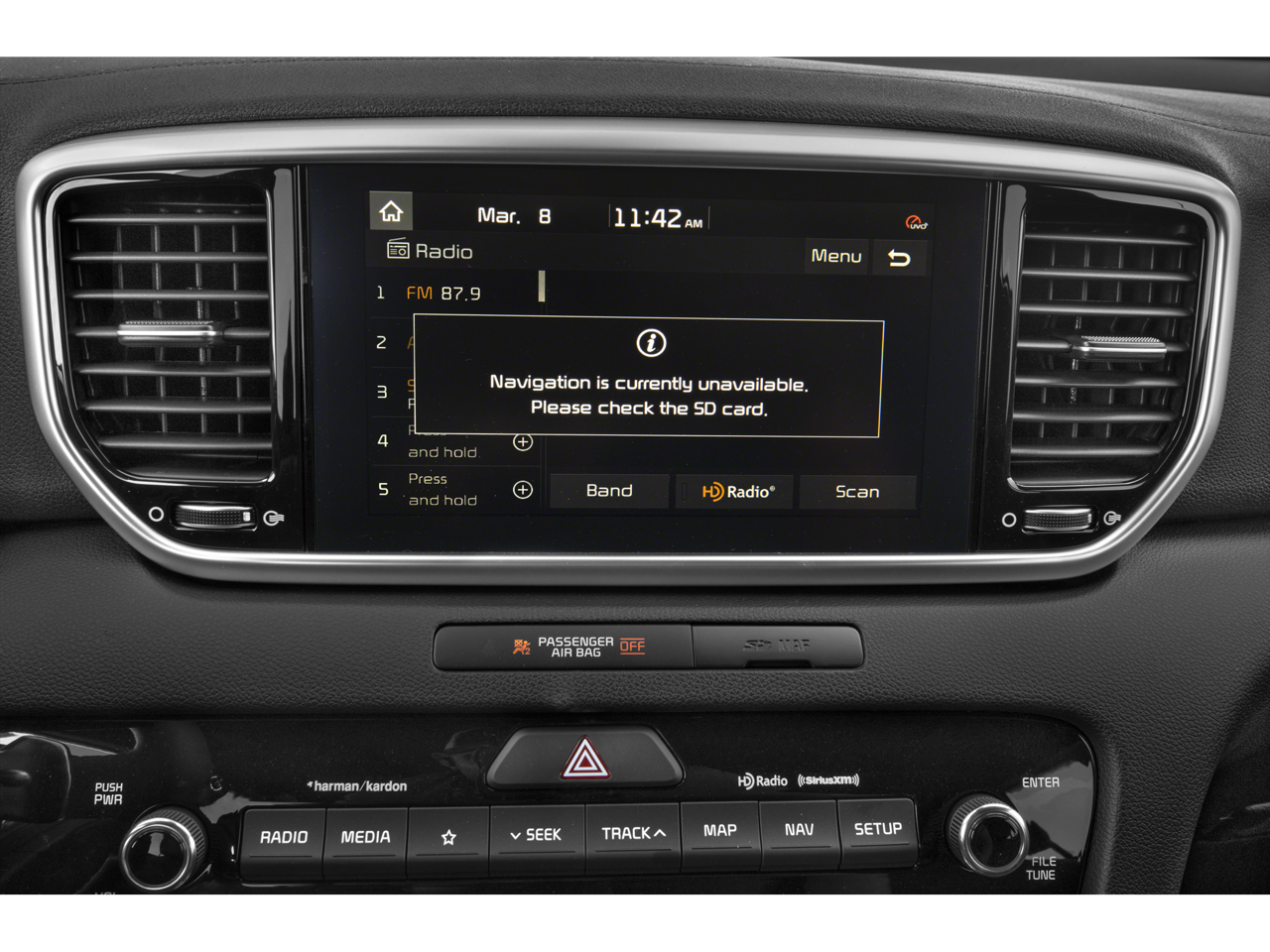 - Radio: AM/FM/SiriusXM Audio System -inc: 8" touchscreen, navigation, 8 speakers including subwoofer, 320 watt harman/kardon premium audio, Clari-Fi, UVO telematics, Apple CarPlay & Android Auto, voice recognition, USB/aux input ports, wireless phone charging, steering wheel controls and Bluetooth® w/audio streaming